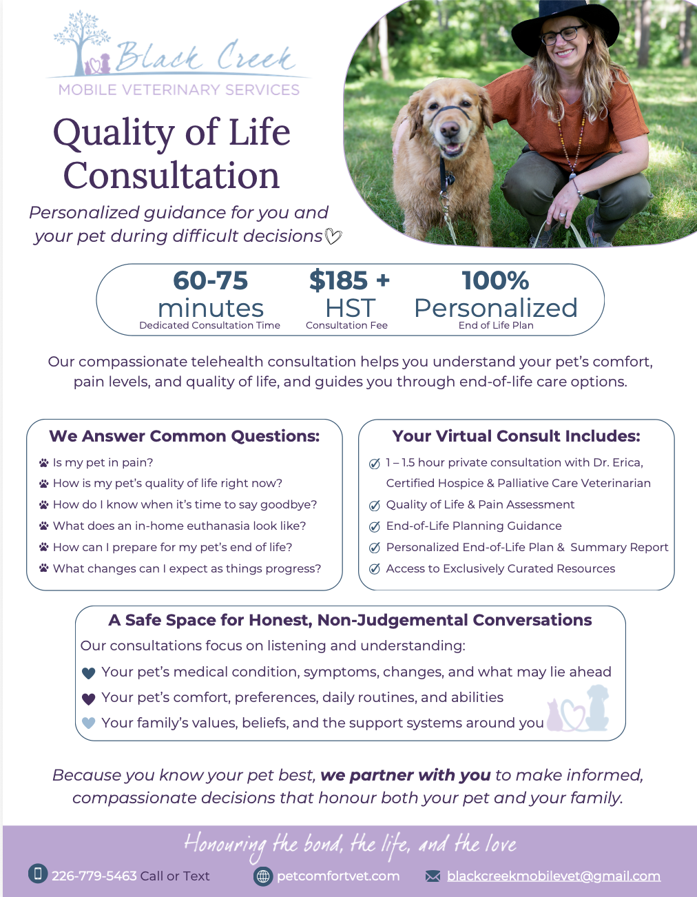 Quality of Life consultations are $185 + HST and include a 60–75 minute telehealth appointment with Dr. Erica Dickie, Certified Hospice & Palliative Care Veterinarian, and a written summary provided within 1–3 business days and access to exclusively curated resources.
